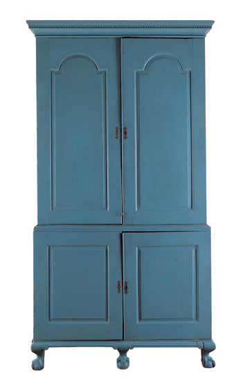 Figure 49 Desk-and-bookcase attributed to Robert Walker, King George County, Virginia, 1750–1760. Yellow pine; remnants of original blue paint under later blue paint. H. 91 1/2", W. 48 5/8", D. 16 3/4". (Courtesy, George Washington’s Mount Vernon, Mount Vernon, Virginia; photo, Gavin Ashworth.)