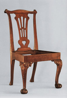 Side chair attributed to Robert Walker, King George County, Virginia, 1745–1755. Walnut with oak and yellow pine. H. 37 7/8", W. 22 3/4", D. 20 3/4". (Colonial Williamsburg Foundation; photo, Hans Lorenz.)