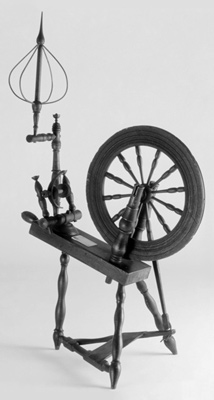 Figure 28 Jonathan Tyson, flax, or spinning, wheel, Philadelphia, Pennsylvania, ca. 1807–1816. Ash with maple, oak, leather, and iron. H. 51", L. 18" (table), W. 6 5/8" (table). (Courtesy, Winterthur Museum, acc. 72.163.)