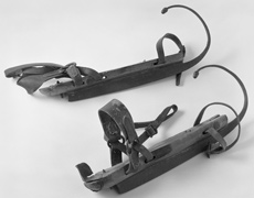 | Figure 35 C. W. Wirths and Brothers, ice skates, Remscheid, Germany, ca. 1833, probably imported into Philadelphia, Pennsylvania. Wood, iron, and leather. L. 13 3/16", W. 2 9/16". (Courtesy, Winterthur Museum, bequest of Henry Francis du Pont, acc. 65.1978.1 and .2.) The Smithsonian Institution owns a related pair of skates with acorn-tipped scrolls at the front and also stamped by Wirths and Brothers. Research indicates that the Wirths Company exported 600 pairs of skates to Christian Hesser in Philadelphia on August 12, 1833. Skates of similar design are visible in Dutch and Flemish genre paintings of village life. Early Dutch and Flemish paintings of rural winter scenes with skaters illustrate similar curved-prow skates. |