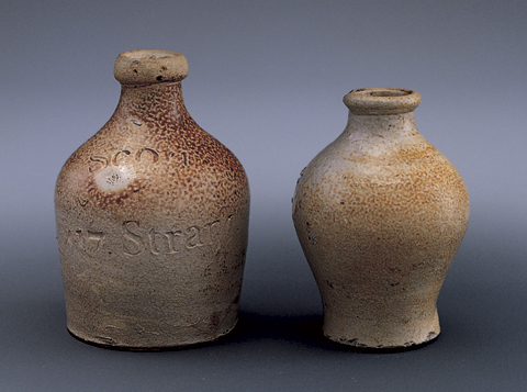 | Figure 16 Ink bottles, London, 17801820. Salt-glazed stoneware. H. of tallest: 3 1/2". These small bottles contained ink or pigments. The bottle on the left is impressed SCOTT, 417 STRAND. John Scott was listed in the London Directory as water Colourman to her Majesty at this address from ca. 17901839. |