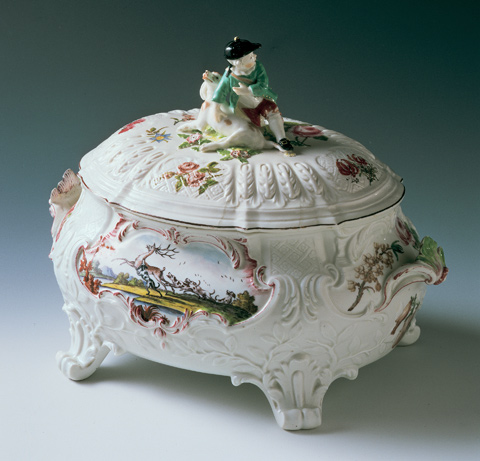 | Figure 5 Tureen, Chelsea Porcelain Factory, London, England, ca. 1754. Soft-paste porcelain. H. 10 1/2". (Courtesy, Winterthur Museum.) The molded and ornamented design of this tureen reflects the silversmith training of Nicholas Sprimont; it is embellished with enamel-painted decoration and gilding attributed to Jefferys Hamett O’Neale. Traditionally thought to have been made for Warren Hastings, now of the Campbell Soup Tureen Collection. |