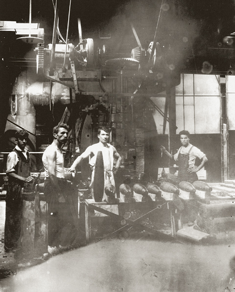 Figure 1 This photograph shows several workmen standing in front of a machine used to press clay slabs into terra-cotta bombs, ca. 1918. Note the finished bombs on the table in the front center of the photograph and the extruded clay slabs stacked on the oor in the front right of the photograph. (Courtesy, Middlesex County Cultural and Heritage Commission.)