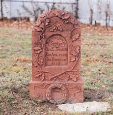 | Figure 1 Gravemarker, Perth Amboy, New Jersey, 1888. Terracotta. H. 34 1/2". (Photographs by Gavin Ashworth unless otherwise noted. ) The Oluf Thulesen marker is made from a single piece of unglazed red terracotta. It is decorated with carefully sculpted oak boughs, complete with acorns. The marker is located in Alpine Cemetery, Perth Amboy. |