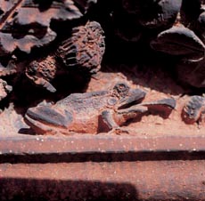| Figure 11 Detail of the frieze on the south side of the gravemarker illustrated in fig. 10. The frieze depicts a menagerie of small animals, including flies, spiders, frogs, and birds. One wonders whether they were intended for the gravemarker or reused from some other project. The frog seen here is about to swallow a spider. The frog is approximately two inches tall. |