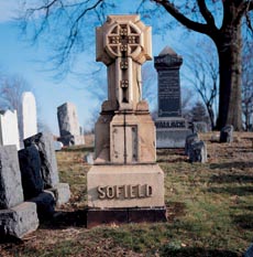 | Figure 12 Gravemarker, Perth Amboy, New Jersey, ca. 1870. Terracotta and marble. H. 88". The Sofield family memorial, located in Alpine Cemetery, is one of the larger surviving terracotta monuments. When erected it was ornamented with four marble plaques inscribed with personal information about the deceased. Only two of these remain: one for David Sofield, age 76, and another for his wife, Mary, age 70. David died in 1873, his wife in 1870. Either the marker is backdated or it was erected after other family members passed on, as there were no terracotta producers in Perth Amboy in 1870. |