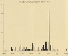 | Figure 27 A bar chart showing dated terracotta gravemarkers and the years in which they were erected. (Courtesy, Richard Veit.) Notice the strong peak in 1918 that coincides with the influenza epidemic brought home by troops returning from World War I. |