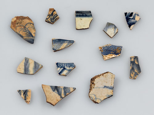Figure 37  Underglaze blue decorated sherds, American China Manufactory, Philadelphia, Pennsylvania, 1770–1772. Soft-paste porcelain. (Courtesy, Philadelphia Museum of Art; photo, Gavin Ashworth.)