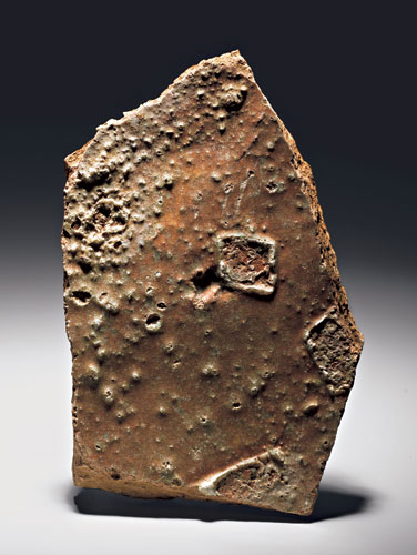 Figure 63 Sagger base fragment, American China Manufactory, Philadelphia, Pennsylvania, 1770–1772. (Courtesy, Philadelphia Museum of Art; photo, Gavin Ashworth.) This example shows diamond-shaped scars of kiln props and a thick layer of glaze built up from repeated firings